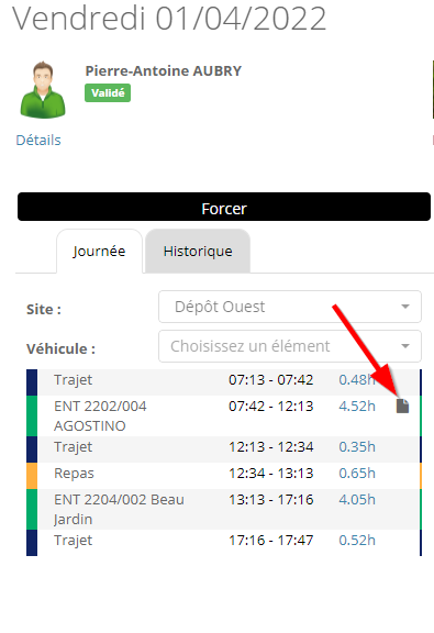 Dans cet exemple on constate que le rapport n’a pas été fait pour le 2eme chantier de la journée.