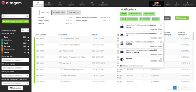 - Amélioration graphique des notifications : Les notifications sont désormais classées en cinq catégories distinctes (Événements RH, Documents, Habilitations, Suivi & Maintenance et Système). Le panneau a été modernisé avec un en-tête clair, des filtres de navigation par catégorie, une liste centrale avec icônes modernisées et une option pour afficher ou masquer les notifications déjà lues.