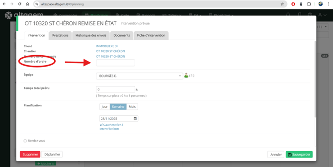 Un nouveau champ a été ajouté dans la fenêtre d’intervention pour permettre, si besoin, de renseigner un numéro d’ordre. Ce champ apparaît uniquement pour les clients concernés et reste facultatif.