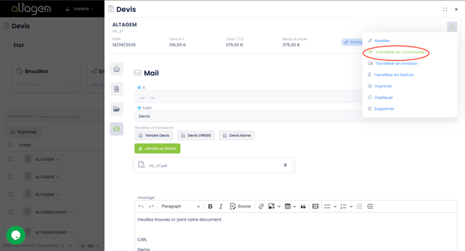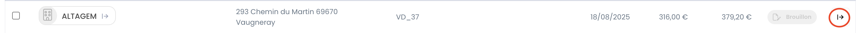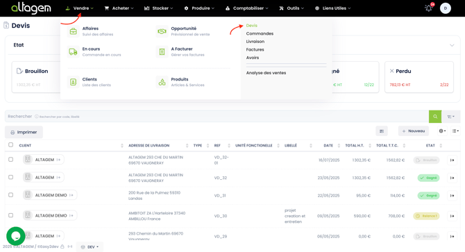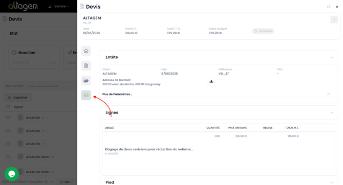 Pour se faire ouvrez le devis (flèche) et cliquez sur l'enveloppe. Vous pouvez directement envoyer le devis à votre client depuis Altagem.
